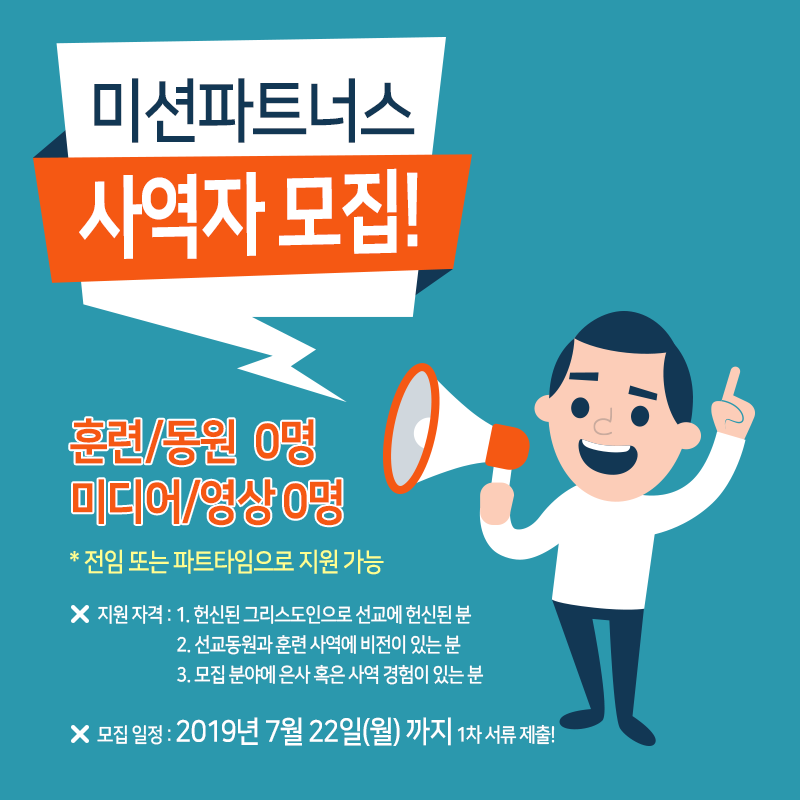 <¹Ì¼ÇÆÄÆ®³Ê½º>¿¡¼ ÇÔ²² ÇÒ »ç¿ªÀÚ¸¦ ¸ðÁý ÇÕ´Ï´Ù😊 ¡¡ ¡¡¹Ì¼ÇÆÄÆ®³Ê½º(Mission Partners)´Â Çѱ¹±³È¸¿Í ±âµ¶ ÀþÀºÀ̵鿡°Ô Ÿ¹®È±Ç ¼±±³ÀÇ Á߿伺À» ¾Ë¸®°í µµÀüÇÏ¿© ¸ðµç ±×¸®½ºµµÀεéÀÌ ÀÚ½ÅÀÇ Àº»ç¿¡ µû¶ó ´Ù¾çÇÑ ¹æ½ÄÀ¸·Î ¼±±³¿¡ Âü¿©ÇÒ ¼ö ÀÖµµ·Ï µ½´Â ¼±±³µ¿¿ø´Üü ÀÔ´Ï´Ù. <¹Ì¼ÇÆÄÆ®³Ê½º>´Â ¼±±³Çѱ¹(Mission Korea) ¿îµ¿À¸·ÎºÎÅÍ Ãâ¹ßÇÏ¿© <¼±±³Çѱ¹ÆÄÆ®³Ê½º>»ç¿ªÀ» °ÅÃļ ÃÖ±Ù <¹Ì¼ÇÆÄÆ®³Ê½º>·Î µ¶¸³ÇÏ¿© Ãâ¹üÇß½À´Ï´Ù. ¡¡ ¡¡<¹Ì¼ÇÆÄÆ®³Ê½º>´Â ±³À° ÈÆ·Ã(ÆÛ½ºÆåƼºê½º, ³Ø½ºÆ®½ºÅÜ, ´Ü±â¼±±³¿©ÇེŬ, ÇÁ·»µå½ÊÆÛ½ºÆ®, »ç°ú³ª¹« ³óÀåÇÁ·ÎÁ§Æ®_DBS, ¹Ì¼Çµð½ºÄ¿¹ö¸®), Æ÷·³(°¢Á¾¼±±³°ü·ÃÆ÷·³), ³×Æ®¿öÅ©(û³â¼±±³µ¿¿ø³×Æ®¿öÅ©, ±³È¸¼±±³µ¿¿ø³×Æ®¿öÅ©), Á¤º¸ÃâÆÇ(SNS, ȨÆäÀÌÁö, ¸Å°ÅÁø, ÃâÆÇ) µîÀÇ »ç¿ªÀ» ÅëÇØ¼ ¼±±³ °ü½ÉÀÚ¿Í Çå½ÅÀÚµéÀ» µµ¿Í »õ·Î¿î ¼±±³»ç¸¦ ¹ß±¼Çϰí, Áö¿ª±³È¸¿Í û³â°øµ¿Ã¼¸¦ ¼±±³Àû °øµ¿Ã¼·Î ¼¼¿ì´Â »ç¿ªÀ» ÇÕ´Ï´Ù. ¡¡ ¡¡³»°¡ ÇÑ ¸íÀÇ ¼±±³»ç·Î ³ª°¡´Â Àϵµ Áß¿äÇÏÁö¸¸ 100¸íÀÇ ¼±±³»ç¸¦ º¸³»´Â ÀÏÀ» ÇÒ ¼ö ÀÖ´Ù¸é ´õ¿í ³î¶ó¿î ÀÏÀÌ µÉ °ÍÀÔ´Ï´Ù. ¼¼°èº¹À½ÈÀÇ ³²Àº °ú¾÷À» ¿Ï¼öÇϱâ À§ÇÑ ¼±±³µ¿¿ø »ç¿ªÀ» ¼¶±æ »ç¿ªÀÚ¸¦ ¸ðÁýÇÕ´Ï´Ù. ´ç½ÅÀÇ Çå½ÅÀ¸·Î ÀÎÇØ¼ ´õ ¸¹Àº ¼±±³»çµéÀÌ ÆÄ¼Û µÇ°í ±× °á°ú ¼¼°èº¹À½È°¡ ¿Ï¼ºµÇ¾î Çϳª´Ô ³ª¶ó°¡ ÀÌ ¶¥¿¡ ÀÓÇÏ´Â ¿ª»ç¸¦ ¾Õ´ç±â´Â ÀÏ¿¡ ¿ì¸® »îÀÇ ÀϺκÐÀ» µå¸± ¼ö ÀÖ´Ù¸é ±×°ÍÀº ÃÖ°íÀÇ ¿µ±¤ÀÌ µÉ °ÍÀÔ´Ï´Ù. ÀÌ ¿µ±¤½º·¯¿î ÀÏ¿¡ ´ç½ÅÀ» ÃÊ´ëÇÕ´Ï´Ù! ¡¡ ¡¡<¹Ì¼ÇÆÄÆ®³Ê½º> »ç¿ªÀ» ÅëÇØ ¼±±³µ¿¿ø°¡·Î ¼±±³¿¡ Âü¿©Çϰí, ¶ÇÇÑ ½º½º·Î°¡ ¼ºÀåÇÏ¿© ÀáÀç·Â ÀÖ´Â ¼±±³ ÀÚ¿øÀ¸·Î Çϳª´Ô²² Çå½ÅÇÏ±æ ¿øÇÏ´Â ºÐµéÀÇ Âü¿©¸¦ ±â´ëÇÕ´Ï´Ù! ¡¡ ¸ðÁý ºÐ¾ß ¹× ä¿ë Àοø> 1) ÈÆ·Ã/µ¿¿ø ºÐ¾ß 0ÀÎ: ÆÛ½ºÆåƼºê½º ÈÆ·Ã, Æ÷·³, ¼¼¹Ì³ª, ³×Æ®¿öÅ© ÁøÇà µîÀ» ÅëÇØ ¼±±³ µ¿¿ø»ç¿ªÀÚ 2) ¹Ìµð¾î/¹®¼ ºÐ¾ß 0ÀÎ: ¿µ»ó, ¹Ìµð¾î, SNS ¡¡ Áö¿ø ÀÚ°Ý🌎 1. Çå½ÅµÈ ±×¸®½ºµµÀÎÀ¸·Î ¼±±³ Çå½ÅÀÚ 2. ¼±±³µ¿¿ø°ú ÈÆ·Ã »ç¿ª¿¡ ´ëÇÑ ºñÀüÀÌ ÀÖ´Â ÀÚ 3. ÇØ´ç ºÐ¾ß¿¡ Àº»ç ȤÀº »ç¿ª °æÇè ȤÀº °ü½ÉÀÚ ¡¡ Á¦Ãâ¼·ù🌎 1. À̷¼ ¹× ÀÚ±â¼Ò°³¼¿Í °£Áõ¹® (*÷ºÎÆÄÀÏ: ¹Ì¼ÇÆÄÆ®³Ê½º Á¦°ø À̷¼ ¾ç½Ä ´Ù¿î·Îµå) 2. ¼·ùÁ¦Ãâó: info@missionpartners.kr ¡¡ ¸ðÁý ÀÏÁ¤🌎 1. 2019³â 7¿ù 22ÀÏ(¿ù)±îÁö 1Â÷ ¼·ùÁ¢¼ö ¸¶°¨. ¼·ù°¡ ±¸ºñµÈ ÀÚ´Â ¸¶°¨ÀÏ Àü Á¦Ãâ ȯ¿µ! 2. 2019¿ù 7ÀÏ 23ÀÏ(È) ¼·ùÀüÇü ÇÕ°ÝÀÚ ¹ßÇ¥ (º¯°æ°¡´É) 3. ¼·ùÀüÇü ÇÕ°ÝÀÚ´Â 2019¿ù 7¿ù 22ÀÏ~25ÀÏ »çÀÌ¿¡ 2Â÷ ¼·ù (¹Ì¼ÇÆÄÆ®³Ê½º Á¦°ø Ãßõ¼) Á¦Ãâ 4. ¼·ùÀüÇü ÇÕ°ÝÀÚ ´ë»ó ¸éÁ¢ÀÏ (2019³â 7¿ù 25ÀÏ~29ÀÏ) 5. ÃÖÁ¾ ¹ßÇ¥ 2019³â 8¿ù 5ÀÏ (Á¤È®ÇÑ ÃÖÁ¾¹ßÇ¥ ÀÏÁ¤Àº º¯µ¿ °¡´É) ¡¡ ¹®ÀÇ¢¸️ 1. info@missionpartners.kr /02-889-6400