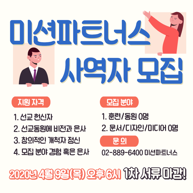 ¹Ì¼ÇÆÄÆ®³Ê½º(Mission Partner)¿¡¼ »õ·Î¿î ¼±±³µ¿¿ø¿¡ Âü¿©ÇÒ °³Ã´ÀÚµéÀ» ÃÊ´ëÇÕ´Ï´Ù. ¸ðµç »ç¶÷ÀÌ º¹À½À» µé¾î¾ß ÇϵíÀÌ ¸ðµç ±×¸®½ºµµÀÎÀº ¼¼°è¸¦ ǰÀº ±×¸®½ºµµÀÎÀÌ µÇ¾î¾ß ÇÕ´Ï´Ù. ¸ðµç ±×¸®½ºµµÀε鿡°Ô ¼¼°è¸¦ ǰÀº ±×¸®½ºµµÀÎÀ¸·Î »ìµµ·Ï Ã˱¸ÇÏ´Â ÀÏÀº ¼±ÅÃÀÌ ¾Æ´Ï¶ó ¿ì¸®¿¡°Ô ÁÖ¾îÁø Ã¥ÀÓÀÔ´Ï´Ù. ÀÌ °ú¾÷¿¡ Âü¿©ÇÒ °³Ã´ÀÚ ¸¶Àε带 ¼ÒÀ¯ÇÑ Ã¢ÀÇÀûÀÎ ¿©·¯ºÐÀ» ÃÊ´ëÇÕ´Ï´Ù. <¹Ì¼ÇÆÄÆ®³Ê½º>´Â Çѱ¹ÀÇ ¸ðµç ¼ºµµµé°ú ±³È¸°¡ ¿Â ¼¼»óÀ» º¹ ÁÖ½Ã±æ ¿øÇϽô Çϳª´ÔÀÇ ¸¶À½À» ¾Ë°í, ¿¹æÀ» ÇâÇÑ ¼±±³Àû »î°ú ½Çõ¿¡ Âü¿©ÇÒ ¼ö ÀÖµµ·Ï µ¿¿øÇÏ´Â ¼±±³´ÜüÀÔ´Ï´Ù. ¢º¹Ì¼ÇÆÄÆ®³Ê½º »ç¿ª µÑ·¯º¸±â www.missionpartners.kr ±³À°ÈÆ·Ã: ÆÛ½ºÆåƼºê½º, ³Ø½ºÆ®½ºÅÜ, ´Ü±â¼±±³¿©ÇེÄð, ÇÁ·»µå½ÊÆÛ½ºÆ®, »ç°ú³ª¹«³óÀåÇÁ·Î Á§Æ®, ÅÙÆ®¸ÞÀÌÄ¿½ºÄð, ¹Ì¼Çµð½ºÄ¿¹ö¸® Æ÷·³: ¼±±³°ü·Ã Æ÷·³ ³×Æ®¿öÅ©: û³â¼±±³µ¿¿ø ³×Æ®¿öÅ©, ±³È¸¼±±³µ¿¿ø ³×Æ®¿öÅ© Á¤º¸ÃâÆÇ: SNS, ȨÆäÀÌÁö, ¸Å°ÅÁø, ÃâÆÇ À§ÀÇ 4°¡Áö ¿µ¿ªÀÇ »ç¿ªÀ» ÅëÇØ¼ ¼±±³ °ü½ÉÀÚ¿Í Çå½ÅÀÚµéÀ» µµ¿Í »õ·Î¿î ¼±±³»ç¸¦ ¹ß±¼Çϰí, Áö¿ª±³È¸¿Í û³â°øµ¿Ã¼¸¦ ¼±±³ °øµ¿Ã¼·Î ¼¼¿ì´Â »ç¿ªÀ» ÇÕ´Ï´Ù. ³»°¡ ÇÑ ¸íÀÇ ¼±±³»ç·Î ³ª°¡´Â Àϵµ Áß¿äÇÏÁö¸¸ 100¸íÀÇ ¼±±³»ç¸¦ º¸ ³»´Â ÀÏÀ» ÇÒ ¼ö ÀÖ´Ù¸é ´õ¿í ³î¶ó¿î ÀÏÀÌ µÉ °ÍÀÔ´Ï´Ù. ÀÌ ¿µ±¤½º·¯¿î ÀÏ¿¡ ´ç½ÅÀ» ÃÊ´ëÇÕ´Ï´Ù! Áö¿ø ÀÚ°Ý 1. ±¹³»¿Ü¿¡¼ ¼±±³Àû »îÀ» »ç´Â ÀÏ¿¡ Çå½ÅµÈ ¼±±³Çå½ÅÀÚ 2. ÈÆ·Ã°ú °øµ¿Ã¼ »ç¿ªÀ» ÅëÇÑ ¼±±³ µ¿¿ø¿¡ ºñÀü°ú Àº»ç¸¦ °¡Áø ÀÚ 3. âÀÇÀûÀÌ°í °³Ã´ÀÚÀûÀÎ ¸¶À½À» °¡Áø ÀÚ 4. ÇØ´ç ºÐ¾ß¿¡ »ç¿ª °æÇè ȤÀº Àº»ç¸¦ °¡Áø °ü½ÉÀÚ ¸ðÁý ºÐ¾ß ¹× ä¿ëÀοø 1. ÈÆ·Ã/µ¿¿ø ºÐ¾ß 0¸í: ÆÛ½ºÆåƼºê½º ¹× ±âŸÇÁ·Î±×·¥ ÈÆ·Ã ÁøÇà, Æ÷·³, ¼¼¹Ì³ª ÁøÇà µîÀ» ÅëÇÑ ¼±±³ µ¿¿ø 2. ¹®¼/µðÀÚÀÎ/¹Ìµð¾î ºÐ¾ß 0¸í: ÈÆ·Ã ±³Àç ÆíÁý, È«º¸¹° µðÀÚÀÎ, ¿µ»ó °ü·Ã ¹Ìµð¾î Á¦Ãâ ¼·ù 1. À̷¼ ¹× ÀÚ±â¼Ò°³¼¿Í °£Áõ(¹Ì¼ÇÆÄÆ®³Ê½º Á¦°ø À̷¼ ¾ç½Ä) ¡è÷ºÎÆÄÀÏ ´Ù¿î·Îµå 2. ¼·ùÁ¦Ãâó: info@missionpartners.kr *À̸ÞÀÏ Á¦Ãâ½Ã ÆÄÀÏ¸í ¿¹½Ã: ¹Ì¼ÇÆÄÆ®³Ê½º Áö¿ø¼_µ¿¿øÈÆ·Ã_È«±æµ¿ ¸ðÁý ÀÏÁ¤ 1. 1Â÷ ¼·ùÁ¢¼ö ¸¶°¨: 2020³â 4¿ù 9ÀÏ(¸ñ) ¿ÀÈÄ 6½Ã ¼·ù°¡ ±¸ºñµÈ ÀÚ´Â ¸¶°¨ÀÏ Àü Á¦Ãâ ȯ¿µ! Ãßõ¼ Áغñ¿¡ µµ¿òÀÌ µÊ 2. 1Â÷ ÇÕ°ÝÀÚ °øÁö: 2020¿ù 4ÀÏ 10ÀÏ(±Ý) 3. 2Â÷ ¼·ùÁ¦Ãâ: 2020¿ù 4¿ù 14ÀÏ(¼ö) ¼·ùÀüÇü ÇÕ°ÝÀÚ 2Â÷ ¼·ù (¹Ì¼ÇÆÄÆ®³Ê½º Á¦°ø Ãßõ¼) Á¦Ãâ 4. ¸éÁ¢ÀÏ: 2020³â 4¿ù 16ÀÏ(¸ñ)~17ÀÏ(±Ý) Áß ¸éÁ¢ÀÚ°¡ °¡´ÉÇÑ ½Ã°£ 5. ÃÖÁ¾ ¹ßÇ¥: 2020³â 4¿ù 20ÀÏ (Á¤È®ÇÑ ÃÖÁ¾¹ßÇ¥ ÀÏÁ¤Àº º¯µ¿ °¡´É) ¹®ÀÇ 1. info@missionpartners.kr /02-889-6400 (Á¤À¯¹Ì °£»ç) 2. ¹Ì¼ÇÆÄÆ®³Ê½º »ç¿ª È®ÀÎ : www.psp.or.kr |