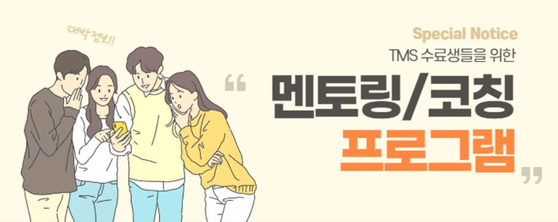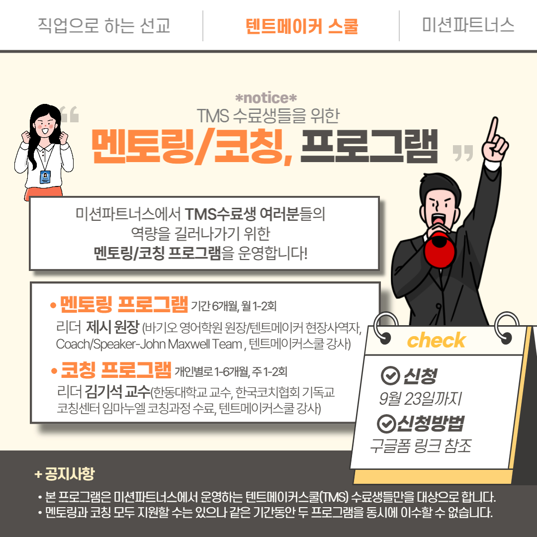 TMS ¼ö·á»ýµéÀ» À§ÇÑ ¸àÅ丵/ÄÚĪ ÇÁ·Î±×·¥! ¹Ì¼ÇÆÄÆ®³Ê½º¿¡¼ TMS¼ö·á»ý ¿©·¯ºÐµéÀÇ ¿ª·®À» ±æ·¯³ª°¡±â À§ÇÑ ¸àÅ丵/ÄÚĪ ÇÁ·Î±×·¥À» ¿î¿µÇÕ´Ï´Ù! °¢ ¸àÅ丵/ÄÚĪ ÇÁ·Î±×·¥Àº ¾Æ·¡¿Í °°ÀÌ ¿î¿µµË´Ï´Ù! 1. ¸àÅ丵 ÇÁ·Î±×·¥ •¸®´õ: Á¦½Ã ¿øÀå(¹Ù±â¿À ¿µ¾îÇпø ¿øÀå/ÅÙÆ®¸ÞÀÌÄ¿ ÇöÀå»ç¿ªÀÚ, Coach/Speaker-John Maxwell Team , ÅÙÆ®¸ÞÀÌÄ¿½ºÄð °»ç) •±â°£: 6°³¿ù, ¿ù 1-2ȸ •ÁøÇà ¹× ±¸¼º: 5-6¸íÀÇ ±×·ìº°/ÆÀº° ¸àÅ丵, ÃÑüÀû ¿ª·® Á¦°í(°³Àοµ¼º/ºñÀü/»ç¿ª¿ª·®)¸¦ ÅëÇØ ¿¸Å ¸Î´Â ÅÙÆ®¸ÞÀÌÄ¿·Î ¼ºÀåÇϱâ À§ÇÑ ±âº»±â¸¦ ´ÙÁü, ÀÌ·ÐÀÌ ¾Æ´Ï¶ó ¸àÅä¿Í ÇÔ²² ½ÇõÇÏ¸ç ¿¸Å ¸Î´Â »îÀÇ ½À°üÈ •ÀÏÁ¤: 1. ¸»¾¸ ¹¬»ó ³ª´©±â: ÁÖ´Ô°ú µ¿ÇàÇÏ´Â »î 2. ÆÐ¹Ð¸® ¹ÌÆÃ: °Ç°ÇÑ °¡Á· °ü°èȸº¹ ¹× ¹ßÀü 3. Life Chart: °³ÀÎÀÇ ÀåÁ¡, ¿Á¤, Çϳª´Ô²²¼ Áֽбâȸ¸¦ ÆÄ¾ÇÇÔÀ» ÅëÇØ »îÀÇ ºñÀü Á¤¸³ 4. IDP: »îÀÇ ÃÑüÀû Æò°¡¿Í ±¸Ã¼Àû °èȹ ¼ö¸³ ¹× ¸ñÇ¥ ´Þ¼ºÀÇ ½À°üÈ 5. Çϳª´ÔÀÇ ¶æ ºÐº° ÇÏ´Â ¹ý + ¸àÅä ±×·ì Çü¼º 6. ÀÏÅÍ ¿µ¼º Å×½ºÆ® : »ç¿ªÀû/Á÷¾÷Àû ¿ª·® ÆÄ¾Ç ¹× Çâ»ó 7. 15°¡Áö ¼ºÀåÀÇ ¹ýÄ¢: ¼ºÀåÇÏ´Â ¸®´õÀÇ »îÀÇ ¿ø¸® •ºñ¿ë: 10¸¸¿ø •¾È³»¿µ»ó: https://youtu.be/9eXcWoE3Sdw 2. ÄÚĪ ÇÁ·Î±×·¥ •¸®´õ: ±è±â¼® ±³¼ö(Çѵ¿´ëÇб³ ±³¼ö, Çѱ¹ÄÚÄ¡Çùȸ ±âµ¶±³ ÄÚμ¾ÅÍ ÀÓ¸¶´©¿¤ ÄÚΰúÁ¤ ¼ö·á, ÅÙÆ®¸ÞÀÌÄ¿½ºÄð °»ç) •±â°£: °³Àκ°·Î 1-6°³¿ù, ÁÖ 1-2ȸ •ÁøÇà ¹× ±¸¼º: Áö¿øÀÚ 5¸í(¼±¹ß°úÁ¤À» °ÅÄ¡Áö ¾ÊÀ½, Ãʰú½Åû½Ã ´ë±â)ÀÌ °³Àκ° 4-10ÁÖµ¿¾È ÁøÇàÇÒ ÅÙÆ®¸ÞÀÌÄ¿½ºÄð °úÁ¤ ¾ÈÀÇ ´Ù¾çÇÑ ÁÖÁ¦Áß ÁÖÁ¦ ¼±Á¤. °³Àκ° ÄÚĪ ³»¿ëÀº öÀúÈ÷ ±â¹Ð·Î ÇÔ. 1. ½º½º·Î ÁÖÁ¦ ¼±Åà ¹× ¸ñÇ¥ ¼³Á¤ 2. ¸ñÇ¥¸¦ ÀÌ·ê ¼ö ÀÖµµ·Ï ÄÚÄ¡°¡ Á¶¾ðÇÏ°í °Ý·Á •ºñ¿ë : Ãʱâ 4-6ȸ ¹«·á, ±× ÀÌÈÄ´Â ±â°£¿¡ µû¶ó 5-10¸¸¿ø •¾È³»¿µ»ó : https://youtu.be/YyGbxh4SDd8